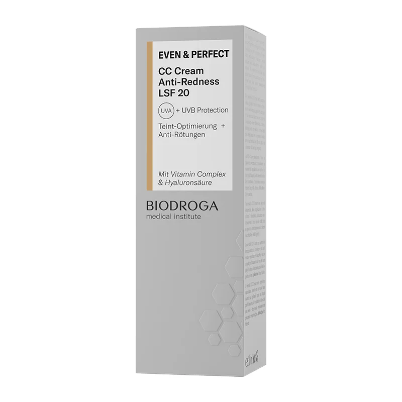 Erleben Sie perfekte Ausstrahlung mit der Even and Perfect CC Cream Anti Redness von Biodroga medical institute. Diese vielseitige CC Cream geht über herkömmliche Make-up-Produkte hinaus, indem sie sich beim Auftragen mit verkapselten Pigmenten in eine maßgeschneiderte Foundation verwandelt. Neben der natürlichen Abdeckung von Unvollkommenheiten werden auch gezielt grüne Farbpigmente eingearbeitet, um Rötungen zu neutralisieren und Ihrer Haut eine gleichmäßige Tönung zu verleihen. Die fortschrittliche Wirkweise der Even and Perfect CC Cream Anti Redness basiert auf einer gezielten Kombination von Inhaltsstoffen, die im Einklang für ein makelloses Erscheinungsbild sorgen. Die verkapselten Pigmente passen sich nahtlos Ihrem Hautton an und bieten eine personalisierte Abdeckung. Die gleichzeitig eingearbeiteten grünen Farbpigmente wirken effektiv gegen Rötungen, um einen ebenmäßigen Teint zu schaffen. Diese innovative Technologie ermöglicht eine maßgeschneiderte Anpassung an Ihren Hautton, um Unvollkommenheiten zu verbergen. Eingearbeitete grüne Farbpigmente zielen darauf ab, Rötungen auszugleichen und die Haut gleichmäßig zu tonen. Die CC Cream kaschiert kleine Makel und Unregelmäßigkeiten sofort bei der Anwendung. Genießen Sie einen strahlenden Teint mit einem frischen und ebenmäßigen Erscheinungsbild. Tauchen Sie ein in die Welt der perfekten Haut mit der Even and Perfect CC Cream Anti Redness von Biodroga medical institute. Erleben Sie die Fusion von hochwertiger Hautpflege und Make-up, die nicht nur Ihre Haut verschönert, sondern auch gezielt Rötungen neutralisiert. Verwandeln Sie Ihre tägliche Routine in ein Beauty-Erlebnis und zeigen Sie sich von Ihrer besten Seite.Hauttyp: Für zu Rötungen neigende Haut.