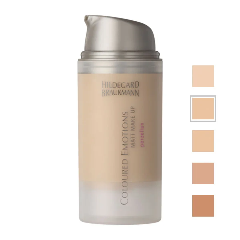 Die softe Rezeptur des matten Make-up in der Farbe Elfenbein Nr. 20 aus der Pflegeserie Coloured Emotions von Hildegard Braukmann verleiht Ihnen ein pudriges Finish. Gleichzeitig versorgt es Ihre Haut mit Feuchtigkeit.Wenn Sie eine Mischhaut oder ölige Haut haben, die zu Unreinheiten neigt, dann ist dieses matte Make-up optimal für Sie. Durch den speziellen 3-fach-Wirkkomplex wird der Teint über Stunden mattiert. Der Sebum-regulierende Wirkstoff aus Avocado bringt die Talgproduktion ins natürliche Gleichgewicht, lindert den Juckreiz und beruhigt Ihre Haut. Mit dem enthaltenen Vitamin E und dem Algen-Extrakt stärkt es aktiv den Zellschutz und steigert den Feuchtigkeitsgehalt der Haut. Zink sorgt dafür, dass Ihre Haut elastisch bleibt und feine Pigmente aus Kieselsäure lassen Fältchen optisch verschwinden. Zurück bleibt eine glatte Haut mit einem seidigen Hautgefühl.