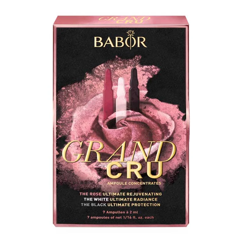 Mit der Grand Cru Edition hat BABOR eine exklusive und außergewöhnliche Ampullenkur für besonders anspruchsvolle Haut geschaffen. Entdecken Sie jetzt die 3 genau aufeinander abgestimmten Ampullen mit exklusiven Rosenextrakten.Das Extrakt aus der Damaszener Rose sorgt für eine sofortige Faltentiefenreduktion, wodurch Ihre Haut glatter erscheint. Ihre Haut wird vor freien Radikalen geschützt und Ihr Teint erscheint in jugendlicher Frische. Die drei Ampullen bieten in 3 Schritten über 7 Tage ein fantastisches Anti-Aging Erlebnis. Durch diese Ampullen wird Ihre Haut regeneriert, verfeinert und geschützt. Die Grand Cru The Rose verjüngt Ihre Haut, verfügt über regenerierende Eigenschaften und einen Soforteffekt. Die Grand Cru The White verbessert die Hautstruktur und verleiht Ihnen so eine jugendliche Ausstrahlung. Zu Guter Letzt dient die Grand Cru The Black als Schutz gegen vorzeitige, umweltbedingte Hautalterung.