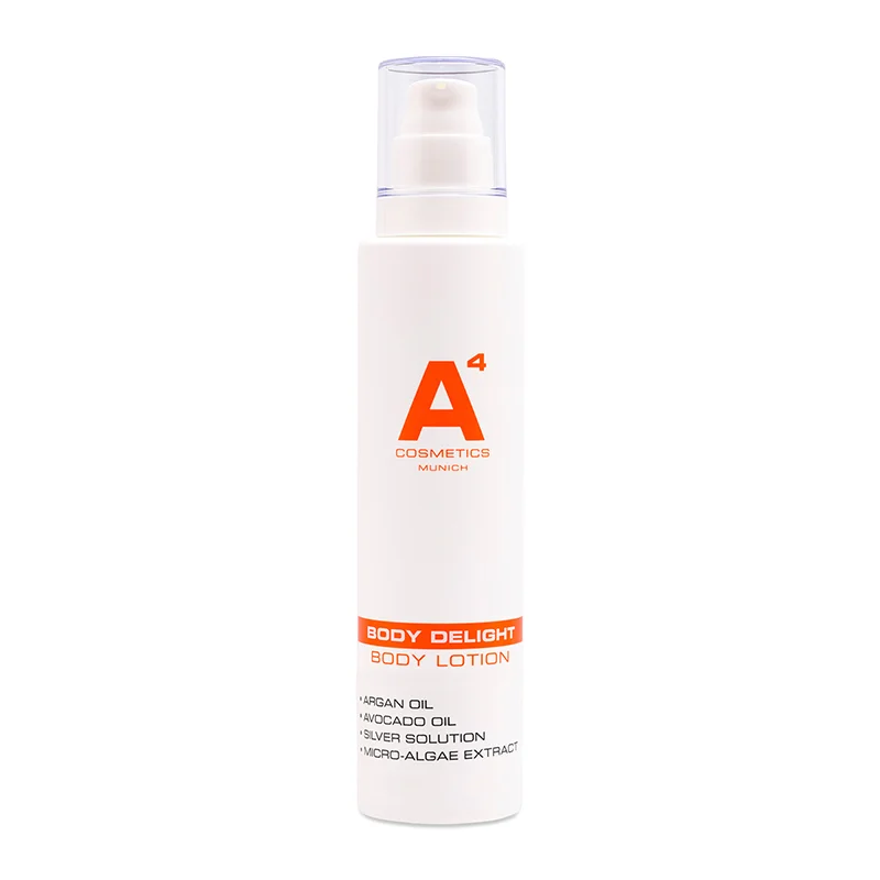 Wirkstoffe: Die natürlichen Lieferanten unserer Pflegesubstanzen, von der Alge über die Avocado bis zur Lärche, machen die A4 Body Delight Bodylotion einzigartig: Reines Schweizer Tiefenquellwasser aus dem UNESCO Biosphärengebiet Entlebuch befeuchtet die Haut intensiv und beruhigt Spannungsgefühle. Eco-zertifiziertes Arganöl wirkt antioxidativ und begünstigt die Faltenreduktion. Avocadoöl aus kontrolliert biologischem Anbau intensiviert diese Wirkung und unterstützt die Hautregeneration. Mit einer Extraportion Feuchtigkeit wird die Haut durch den Natural Moisturizing Factor NMF versorgt, einer Mischung aus verschiedenen hydratisierenden Substanzen. Ein Mikroalgenextrakt (aus der Grünalge Chlorella vulgaris) trägt durch seinen hohen Anteil an Proteinen und Aminosäuren dazu bei, die Festigkeit und den Hauttonus zu erhöhen, indem die Kollagen- und Elastinsynthese stimuliert wird. Dehnungsstreifen erscheinen in Größe und Farbe reduziert und die Aktivierung des Lymphabflusses wird unterstützt. Ein aus der Lärche extrahiertes Polysaccharid unterstützt die Hautbarriere und reguliert den Feuchtigkeitshaushalt der Haut.