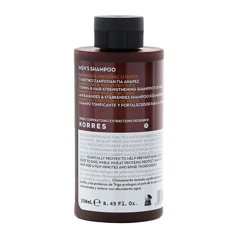 Das Magnesium und Wheat Protein Shampoo von Korres ist ein aufbauendes und stärkendes Shampoo für den Mann. Die Multimineral-Kombination aus Kalzium, Magnesium, Mangan und Zink bringt die verlorene Energie in den Zellen der Kopfhaut zurück und stärkt so feines, brüchiges Haar von der Wurzel an.Die Multimineral-Kombination aus Kalzium, Magnesium, Mangan und Zink verbirgt sich im Magnesium und Wheat Protein Shampoo von Korres. Das aufbauende und stärkende Shampoo für den Mann bringt die verlorene Energie in den Zellen der Kopfhaut zurück. Es stärkt so feines, brüchiges Haar von der Wurzel an. Das Provitamin B5 macht das Haar fülliger und reduziert Spliss. Die enthaltenen Reis- und Weizenproteine verstärken die Elastizität der Haare und schützen so vor Haarbruch.