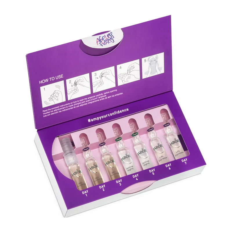 Dieses exklusive Ampullen-Set Ageless Hero von Babor hilft, die Hautregeneration zu unterstützen. Ihre Haut wird geglättet und erhält ihre Elastizität zurück.Diese Kur wird über sieben Tage angewendet und unterstützt Ihre Haut bei der Regeneration. Die Ampullen-Kur besteht aus 3 Stück 3D Firming Ampullen, 2 Stück Active Night Ampullen und 2 Stück Lifting Express Ampullen und beinhaltet jeweils 2ml Inhalt. Die 3D Firming Ampulle glättet und festig Ihre Haut, während die Active Night Ampulle die Haut über Nacht bei der Regeneration unterstützt. Der Lift Express Komplex reduziert die Faltentiefe. Die hochwirksamen Wirkstoffkomplexe verbessern die Elastizität und Festigkeit Ihrer Haut, wodurch sie sofort glatter wirkt. Sie erhalten eine geballte Power an Wirkstoffen, die perfekt aufeinander abgestimmt sind und Ihrer Haut die benötigte Pflege gibt!