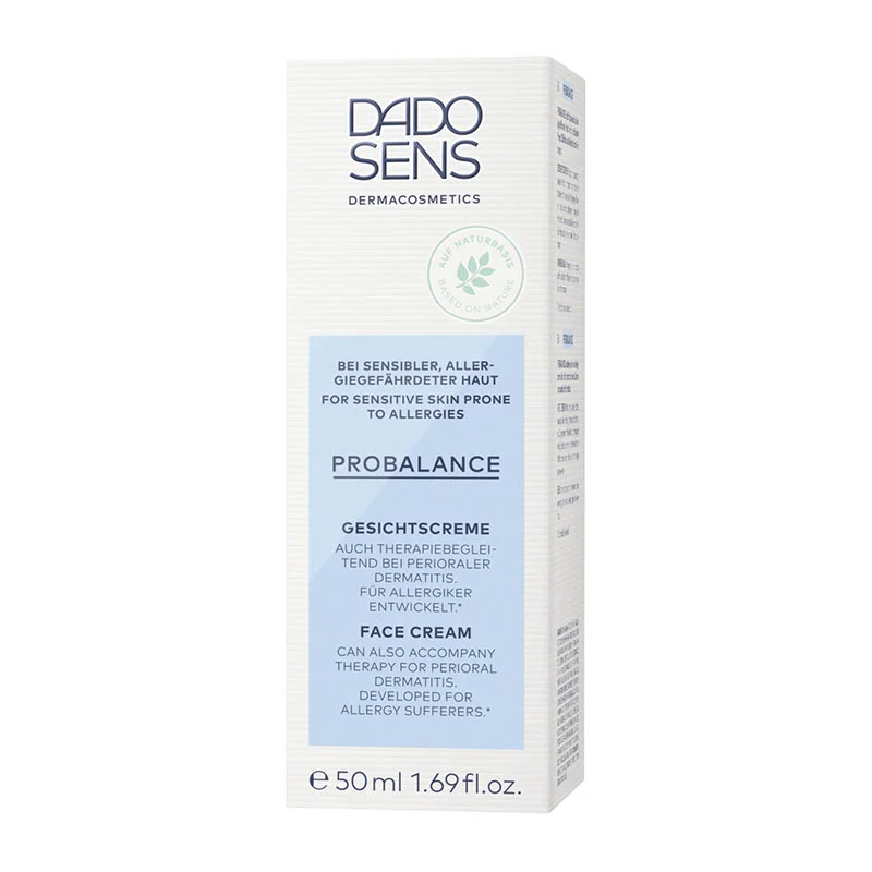 Mindern Sie Rötungen und Juckreiz mit der Gesichtscreme vom DADO SENS aus der PROBALANCE Serie. Sie spendet Feuchtigkeit und bringt Ihre Haut wieder ins natürliche Gleichgewicht.Rötungen, Brennen und Juckreiz sind störende Faktoren, die keiner gerne haben möchte! Mit der PROBALANCE Serie erhalten Sie Produkte, die Ihre sensible und zu Allergien neigende Haut pflegen und schützen. Die Gesichtscreme enthält Aloe Vera aus Bio-Anbau, welches antientzündlich und beruhigend wirkt und Ihre Haut intensiv mit Feuchtigkeit versorgt. Die zarte Textur zieht schnell ein und macht Ihre schuppige und trockene Haut wieder geschmeidig-weich. D-Panthenol fördert die Zellerneuerung und verbessert die Hautelastizität. Zudem bindet es die Feuchtigkeit und wirkt regenerierend. Allantoin wirkt reizlindernd und mindert Rötungen und Juckreiz. Weitere Wirkstoffe schützen vor freien Radikalen und vor vorzeitiger Hautalterung. Auch werden UV-bedingte Hautschäden vorgebeugt. Damit die gewonnene Feuchtigkeit nicht wieder verloren geht, enthält die Gesichtscreme Ceramide, die vor Feuchtigkeitsverlust schützen. Durch ihren Wirkstoffcocktail ist die Creme auch optimal zur therapiebegleitenden Anwendung bei perioraler Dermatitis geeignet. Das Resultat ist eine glatte und erfrischte Hautstruktur.