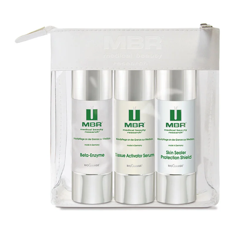 Wenn Sie nicht eine Füllen an Pflegeprodukte mit auf Ihren Reisen nehmen möchten, bietet MBR Medical Beauty Research die perfekte Lösung! Mit der optimalen handlichen Verpackungsgröße haben Sie alles, was Ihre Haut benötigt. Mit dem Beta-Enzyme lösen Sie schonend und tiefenwirksam Verhornungen und Talg- und Lipidablagerungen. Anschließend unterstützen Sie mit dem Tissue Activator Serum den Gewebeaufbau und die Collagenbildung. Es verbessert die Elastinstruktur und strafft die Haut. Abschließend verwenden Sie das Skin Sealer Protection Shield. Diese reichhaltige Creme pflegt und schützt die Haut vor freien Radikalen. Durch seine Wirkstoffe fühlt sich Ihre Haut spürbar glatter an. Somit ist Ihre Haut perfekt für den Tag vorbereitet!