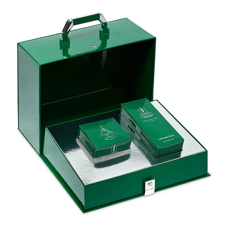 Eine zusätzlichen Energieschub und wohltuende Erfrischung erzielen Sie mit der Medical Box. Sie beinhaltet das Liquid Surgery Serum und die Cream Extraordinary. Beide Produkte erhalten Sie mit 50ml Inhalt. Mit den perfekt aufeinander abgestimmten Wirkstoffen geben Sie Ihrer Haut die Pflege, die sie benötigt. Das Liquid Surgery Serum verleiht Ihnen eine jugendlicheres Ausstrahlung und stärkt Ihre Haut. Mit der Cream Extraordinary pflegen Sie die gereizte, trockene, irritierte und geschädigte Haut. Die Hautoberfläche wird geglättet und gestrafft. Mit dieser grünen Box erhalten Sie eine Anti-Aging Behandlung der Extraklasse. Ihr Teint erscheint ausgeglichener, glatter und herrlich weich.