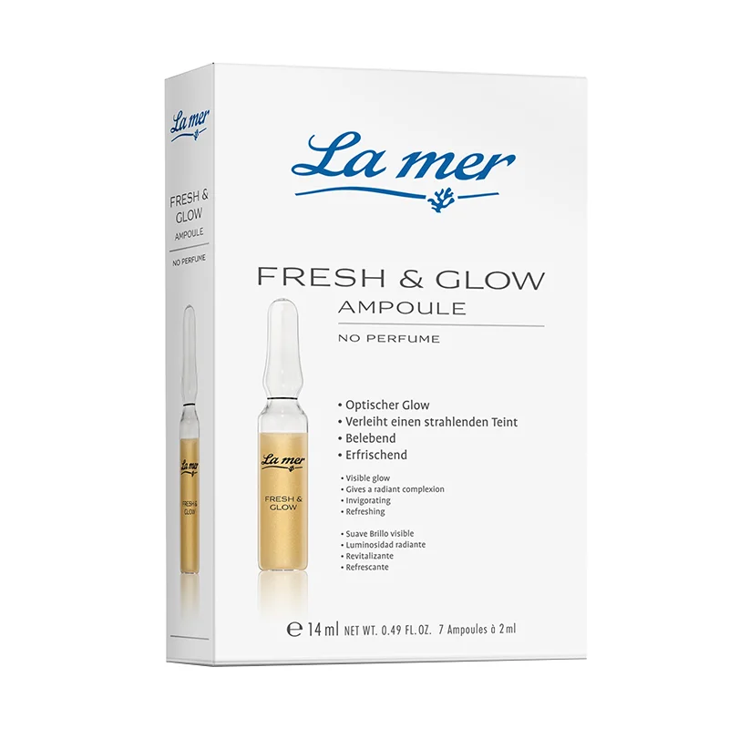 Die Fresh und Glow Ampulle von La Mer frischt Ihre müde Haut auf und schenkt einen leichten Goldschimmer. Ihre Haut wirkt belebt und erfrischt.Wenn Ihre Haut müde und ohne Ausstrahlung ist, hilft Ihnen diese Fresh und Glow Ampulle. Die Packung beinhaltet 7 Stück á 2ml. Dank des enthaltenen Goldschimmers verleiht das Konzentrat Ihrer müden Haut eine Extraportion Frische und Glanz. Grünalgenextrakt spendet Ihrer Haut nachhaltig Feuchtigkeit und Meeresschlick-Extrakt stärkt die Schutzbarriere. Zudem versorgt es Ihre Haut mit Spurenelementen und Mineralstoffen. So wird Ihre Haut widerstandsfähiger. Der pflanzliche Algentaurin aus Jania rubens Extrakt reduziert die Anzeichen von Müdigkeit. Das Ergebnis ist eine erfrischte und belebte Hautoberfläche. Ganz ohne Parfüm, Silikone, Parabene, PEGs und Paraffine.