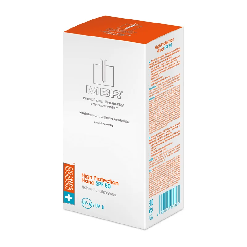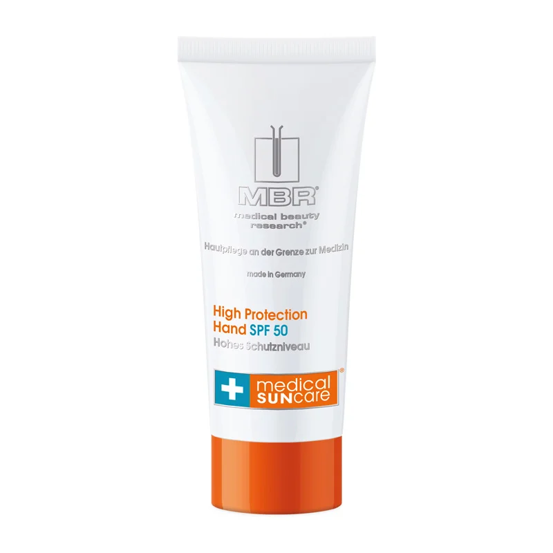 Schützen und pflegen Sie Ihre sonnenempfindlichen Hände mit der High Protection Hand SPF 50 aus der Pflegeserie Medical Sun Care von MBR Medical Beauty Research. Die Creme bietet zuverlässigen Schutz vor der Sonne. Ihre Haut bleibt geschmeidig.Unsere Hände sind jeder Witterung ausgesetzt, auch der Sonne. Damit Sie immer gepflegte Hände haben, schützt die High Protection Hand SPF 50 besonders zuverlässig während des Sonnenbadens. Gerade wenn Sie sich viel an der frischen Luft aufhalten, ist dieser Schutz unabdingbar. Die enthaltenen Wirkstoffe schützen vor UV- und Infrarot-Strahlung. Sie verhindert sonnenbedingte Fältchen und Pigmentierungen. Zudem regeneriert die Creme Ihre sonnenempfindliche Haut. Da Ihre Haut intensiv mit Feuchtigkeit versorgt wird, bleibt sie geschmeidig und glatt. Sie können Ihre Freizeitaktivitäten ohne Reue genießen.