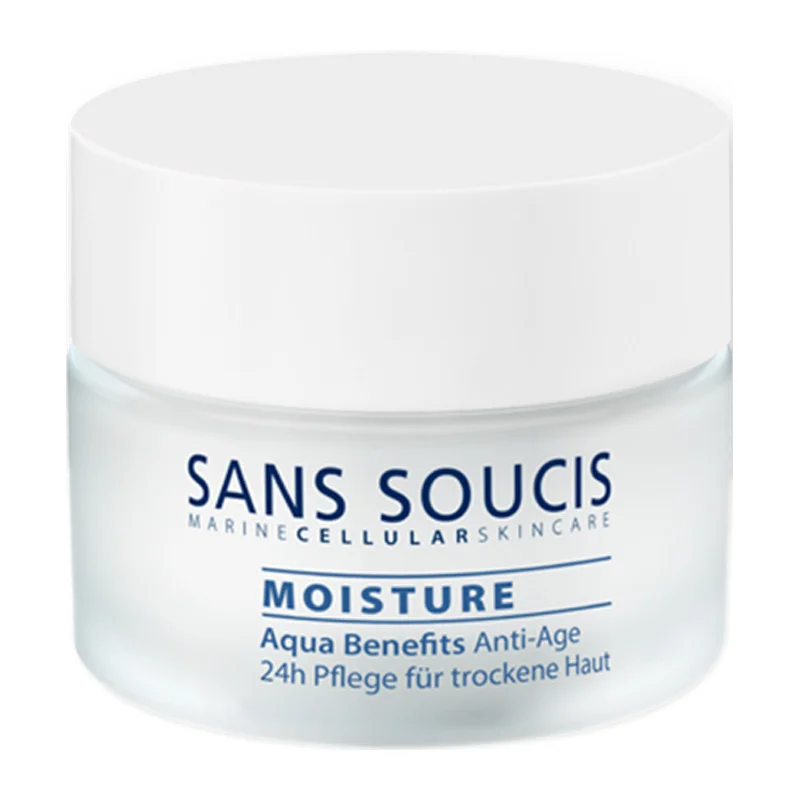 Die Anti-Age 24h Pflege für trockene Haut aus der Moisture Aqua Benefits Reihe von Sans Soucis, versorgt Ihre Haut mit tiefenwirsamer Feuchtigkeit und hautregenerativen Wirkstoffen. Ihre Haut wird es Ihnen danken und wird wieder zart und geschmeidig.Wenn Ihre Gesichtshaut spannt und zu Trockenheitslinien und Fältchen neigt, ist dies ein Anzeichen dafür, dass der Feuchtigkeitsspeicher Ihrer lipidarmen Haut wieder aufgefüllt werden muss. Mit ihren drei pflegefördernden Leitwirkstoffen, bestehend aus Mikroalgenextrakt, Hyaluronsäure und Super Hyaluronsäure (Sodium Acetylated Hyaluronate), gibt die reichhaltige 24h Anti-Age Pflege von Sans Soucis Ihrer Haut Elastizität, Spannkraft und Geschmeidigkeit zurück. Für den zusätzlichen Schutz vor dem Austrocknen Ihrer Gesichtshaut und die Anregung des natürlichen Hautzellenstoffwechsels, ist der Mikroalgenextrakt verantwortlich. Hyaluronsäure versorgt die oberen Hautschichten mit wertvoller Feuchtigkeit und gleicht Spannungsgefühle aus. Für eine Extraportion an tiefenwirksamer Feuchtigkeit, sorgt die Super Hyaluronsäure, die noch tiefer in Ihre Haut eindringt und sie sanft aufpolstert. Das Produkt enthält keine tierischen Inhaltsstoffe und ist frei von Mineralölen, Parabenen, Mikroplastik und Farbstoffen.