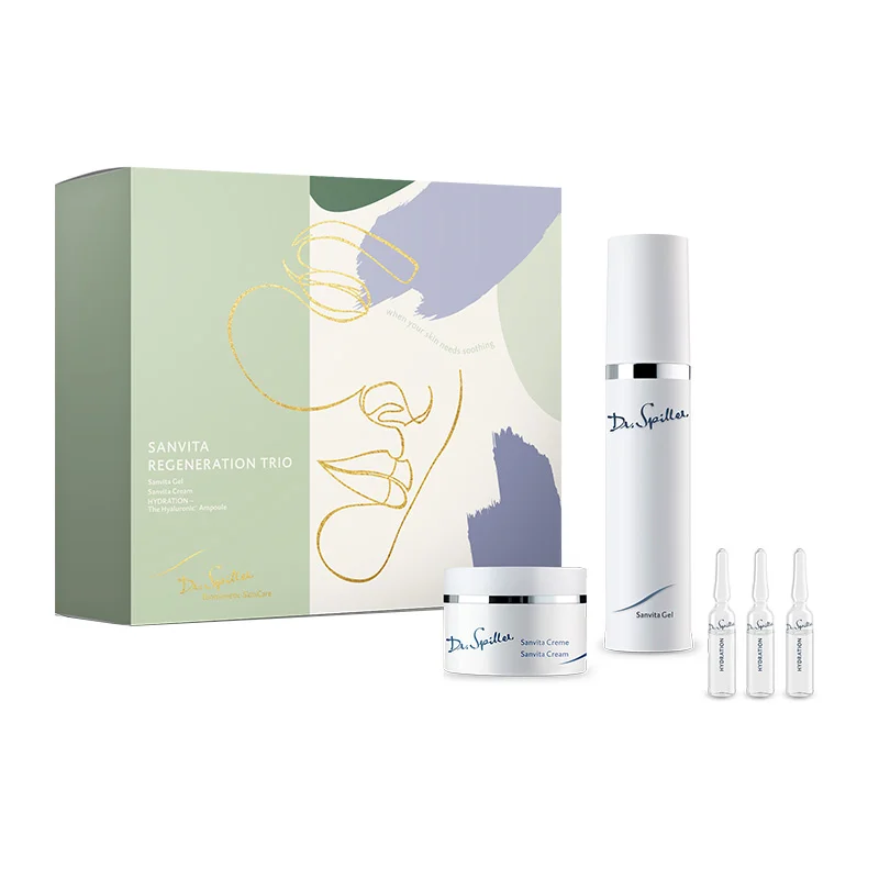 Ihre Haut ist täglich äußeren Umwelteinflüssen und Temperaturschwankungen ausgesetzt, die Haut reagiert auf diese Einflüße gestresst: es entstehen Hautirritationen und die Hautalterung wird beschleunigt. Eine Lösung bietet das Sanvita Regeneration Trio von Dr. Spiller. Im Set enthalten sind zwei Klassiker aus der Sanvita Pflegereihe und Feuchtigkeitsampullen, die die Haut wieder ins natürliche Gleichgewicht bringt.