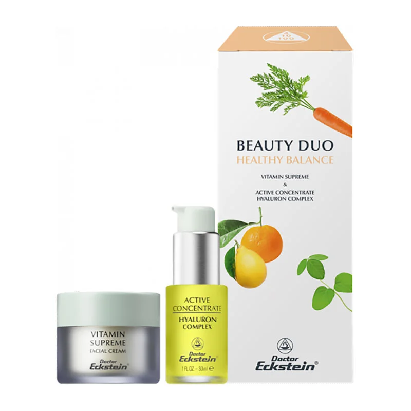 Mit dem Healthy Balance Set von Dr. Eckstein pflegen und schützen Sie Ihre Haut. Das Set beinhaltet die Vitamin Supreme Creme (50 ml) sowie das Hyaluron Active Concentrate (30 ml). Das Hyaluron Active Concentrate wirkt mit hochdosierter Hyaluronsäure und Fructose. Es hinterlässt ein erfrischendes Hautgefühl. Ihre Haut wird sofort intensiv mit Feuchtigkeit versorgt und erhält neue Spannkraft. Es ist sowohl für die lokale Behandlung von kleinen, beispielsweise trockenen Hautarealen als auch zur Intensivpflege Ihres Gesichts geeignet. Die perfekte Ergänzung dazu stellt die Vitamin Supreme Creme da. Eine besonders reichhaltige Wasser-in-Öl-Emulsion. Die Vitamin Supreme versorgt Ihre Haut mit hochwirksamen Wirkstoffen und schützt sie vor negativen Einflüssen. Angereichert mit wichtigen Vitaminen A und E wird Ihre Haut intensiv genährt. Sie erhält neue Spannkraft und Frische. Vor allem in den Herbst- und Wintermonaten wird Ihre Haut sehr strapaziert. Heizungsluft trocknet Sie aus und die Temperaturen schädigen die Oberfläche. Das enthaltene Bienenwachs macht Ihre Haut seidig-zart und stärkt gegen Alltagsstrapazen. In dieser Zeit eignet sich die Vitamin Supreme Creme Optimal als Nachtpflege. Sie schenkt Ihrer Haut Elastizität und Sie wird sichtbar regeneriert. Schenken Sie Ihrer Haut mit dem Beauty Duo Healthy Balance Set eine perfekt aufeinander abgestimmte Pflege bei trockener Haut und einen Frischekick.