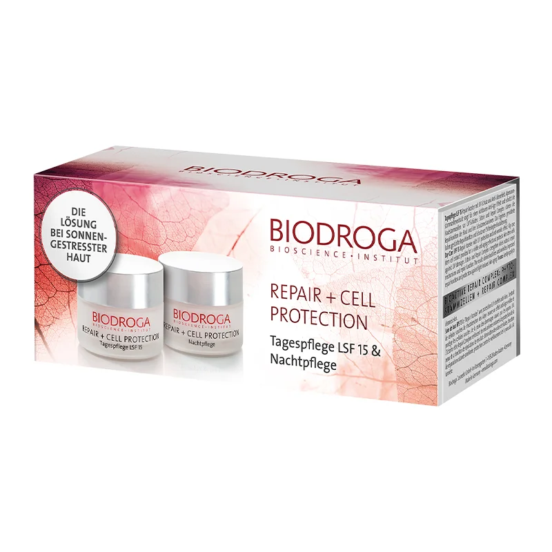 Mit diesem Duo kommt Ihre Haut perfekt durch den Sommer. Es beinhaltet die Tagespflege mit Lichtschutzfaktor 15 sowie die pflegende Nachcreme. Die Tagespflege kurbelt die natürliche Reparaturfunktion an und verbessert die Elastizität des Bindegewebes. Sie schützt Ihre Haut vor schädlicher UV-Strahlung und mit angereichertem Alpenrosenstammzellen Extrakt erzielt sie einen sichtbaren Anti-Falten Effekt. Der Wirkstoff sorgt dafür, dass die Hautstammzellen vor UV-Strahlung geschützt werden und eine längere Lebensdauer aufweisen. Die Haut wirkt länger jugendlich frisch und deutlich vitaler. Die Tagescreme besteht aus einem Ectoin und Repair Complex. Dadurch werden der hauteigene Regenerationsprozess und der Schutzmechanismus gestärkt. Um Ihrer Haut bei der Regeneration zu helfen, können Sie die Nachtpflege verwenden. Denn sie ist der wahre Repair Booster. Abends aufgetragen, sorgt sie für eine intensive Reparatur während Sie schlafen. Auch sie ist angereichert mit Alpenrosenstammzellenextrakt und geht gezielt gegen UV-Stress vor. Die Widerstandskraft Ihrer Haut wird gestärkt und durch den Ectoin und Repair Complex werden Falten gemildert. In der Regenerationsphase wird die Hauterneuerung über Nacht beschleunigt. Schützen Sie Ihre Haut und profitieren Sie von einem jugendlichen, frischen Hautbild.