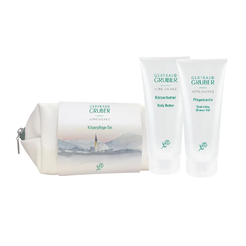 Die beiden Alpine Balance Körperpflege-Produkte von Gertraud Gruber bilden ein Wellness-Paket zum Verschenken oder zum Kennenlernen. Gratis dazu erhalten Sie oder die beschenkte Person eine weiße Kosmetiktasche.