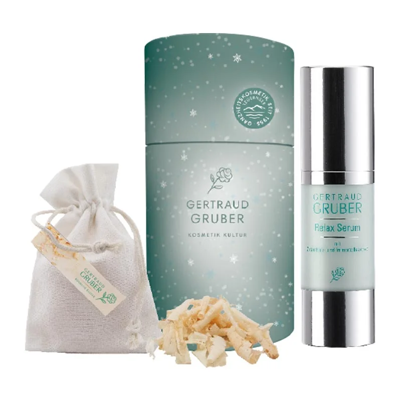 Wenn Ihre Haut eine Extraportion Entspannung benötigt, ist dieses Relax Set von Gertraud Gruber perfekt geeignet. Es enthält das Relax Serum und ein Zirbenholz-Säckchen. Das Serum verbessert das Hautbild und optimiert die Hautbarriere. Es lässt sich leicht in die tägliche Pflegeroutine integrieren und versprüht einen wohlwollenden Duft. Als kleines Extra bietet dieses Set das Zirbenholz-Säckchen, welches einen wohltuenden Duft verbreitet. Vielleicht möchten Sie diesen Duft in Ihrem Wäscheschrank oder einfach, um Ihren Körper und Geist zu entspannen.