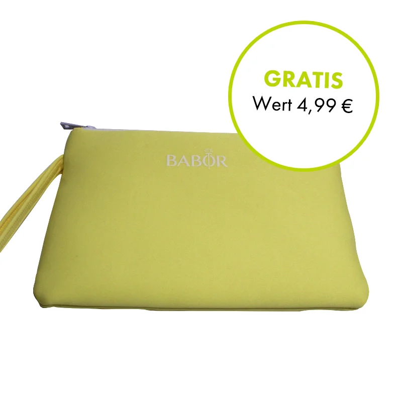Die Kosmetiktasche von Babor ist ein perfekter Begleiter für den Urlaub. Sie hat die Maße 26 x 19 cm und hat ein Hauptfach. Somit haben Sie genügend Platz für Ihre Pflegeprodukte. Durch das Neoprenmaterial ist sie optimal für den Strandurlaub geeignet.