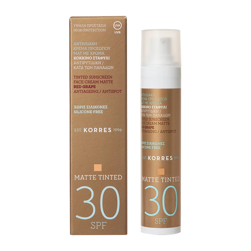 Schützen Sie Ihre Haut mit der Red Grape SPF30 getönten Sonnencreme matt aus dem Hause Korres vor den Sonnenstrahlen.