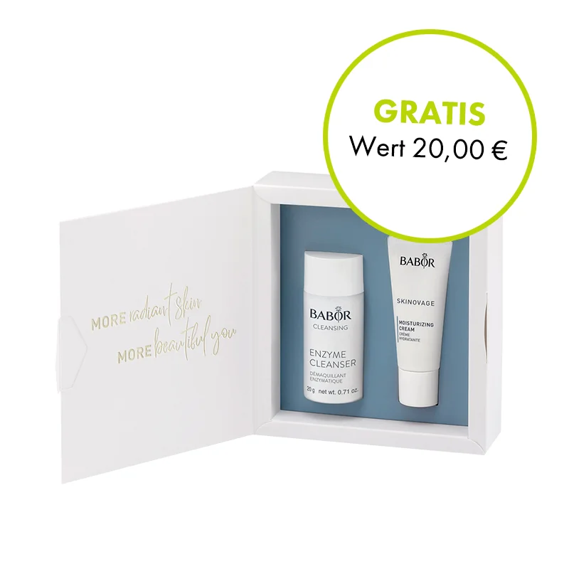 Sie möchten Ihre Haut mit einem leichten Peelingeffekt gründlich reinigen und anschließend mit einer extra Portion Feuchtigkeit versorgen? Dann ist das Skiovage Set von BABOR genau richtig. In Verbindung mit Wasser, schäumt das Pulver des Enzyme Cleansers leicht auf und reinigt auf schonende Weise. Das feinkörnige Reinigungspulver enthält Vitamin C und hat eine keratolytische Wirkung. Durch die intensive, aber sanfte Gesichtsreinigung, bei der abgestorbene Hornzellen sanft von der Hautoberfläche entfernt werden, wird Ihre Haut revitalisiert und fühlt sich spürbar glatt und geschmeidig an. Die Rezeptur der Moisturizing Cream spendet Ihrer Haut mit dem DEEP MOIST Extract in Verbindung mit Hyaluronsäure und Panthenol maximale Feuchtigkeit. Die Haut wirkt durchfeuchtet und erholt. Ebenso hier wird, beruhend auf den Forschungsergebnissen der Epigenetik, ein spezielles Power-Peptid zur perfektionierten Hautregeneration und für einen glatteren, jugendlicheren Teint eingesetzt. Sie erhalten ein klares Hautbild, eine erfrischende Ausstrahlung und eine samtig weiche Haut.
