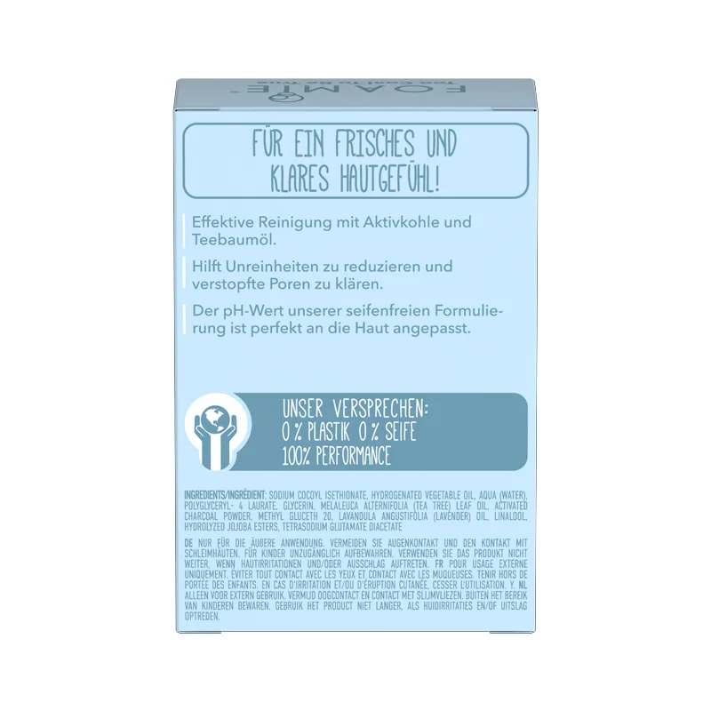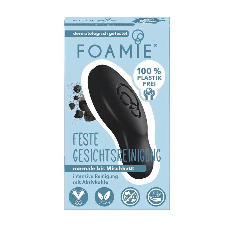 Unreinheiten können Sie nun umweltschonend mit der festen Gesichtsreinigung von Foamie sanft entfernen. Die seifenfreie Formulierung basiert auf Syndet und ist dem pH-Wert der Haut angepasst. Die enthaltene Aktivkohle wirkt wie ein Magnet. Denn sie zieht den Talg aus den Poren und wirkt zugleich antibakteriell. Teebaumöl unterstützt die Aktivkohle bei der Beseitigung von Hautunreinheiten. Diese Gesichtsreinigung wurde dermatologisch getestet und ist frei von Parabenen, Silikonen, Sulfaten, Mikro- und Nanoplastik. Ihre ergonomische Formgebung sorgt für eine einfache Handhabung. Sie versprüht einen angenehmen Duft und sorgt für eine intensive Reinigung, ohne ein Spannungsgefühl zu hinterlassen. Durch ihre feste, vegane Struktur ist die Gesichtsreinigung äußerst ergiebig und reicht für bis zu 85 Anwendungen.