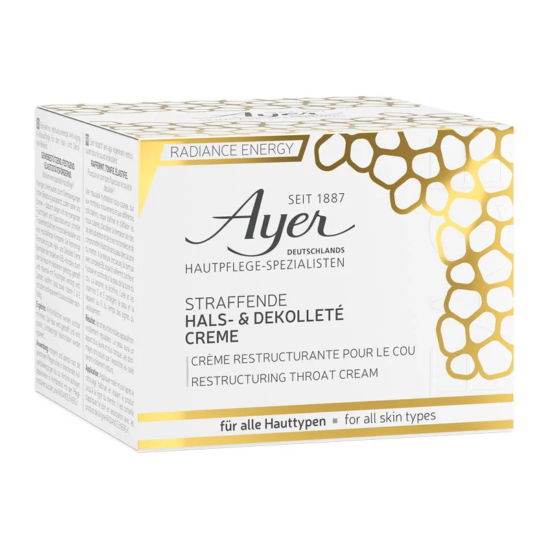 Verleihen Sie Ihrer Haut neue Spannkraft und Elastizität mit der verbesserten, straffenden Hals- und Dekolleté Creme aus der Radiance Energy Serie von Ayer.
