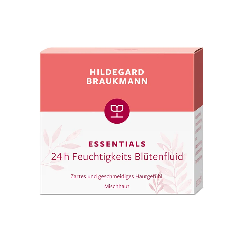 Eine optimale Feuchtigkeitspflege bietet Ihnen Hildegard Braukmann mit dem 24h Feuchtigkeits Blütenfluid aus der Essentials Linie. Es wirkt erfrischend und verfeinert das Hautbild.