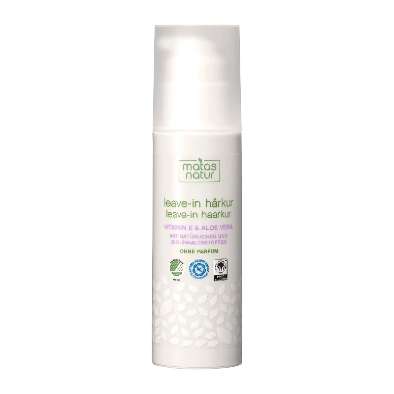 Matas Natur Leave-in Haarkur ohne Parfum. Der Name dieser Haarkur verrät es, ihre Pflegeformel ist so sanft, dass sie nach dem Waschen im Haar verbleibt. Die cremige Haarkur macht das Haar geschmeidig und verbessert die Kämmbarkeit. Da sie nicht ausgespült wird, bleiben die Wirkstoffe bis zur nächsten Haarwäsche aktiv: Bio-Aloe Vera spendet Feuchtigkeit, Provitamin B5 glättet und Vitamin E schützt die Haarstruktur. Betain stärkt, verbessert die Elastizität der Haare und verleiht ihnen Glanz.Das Nordic Ecolabel (Nordic Swan) wird von den Ländern Finnland, Norwegen, Schweden, Dänemark und Island vergeben, um die Qualität und Unbedenklichkeit der Produkte auszuzeichnen. Auch der Umweltschutz spielt im Rahmen der Zertifizierung eine große Rolle. Speziell beauftragte Institute prüfen, analysieren und bewerten die Produkte ausgiebig.