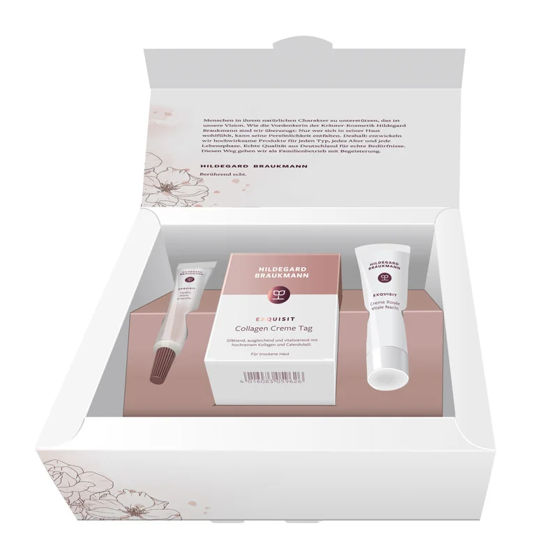 Sie möchten gerne mal die Produkte von Hildegard Braukmann ausprobieren? Dieses Set hilft Ihnen dabei. Denn es enthält die Collagen Creme Tag in Originalgröße, sowie die Creme Rosee Vitale Nacht und Hydro Aktiv Ampulle in einer Kennenlerngröße. Die Tagescreme glättet und wirkt ausgleichend und vitalisierend. Denn sie enthält hochreines Kollagen und Calendulaöl. Das Feuchtigkeitsbindevermögen wird gesteigert und die Haut gefestigt. Ebenso wird es hautberuhigend. Die sahnige Textur lässt sich gut auftragen und zieht schnell ein. Die Nachtcreme pflegt intensiv und regeneriert Ihre Haut mit natürlichem Rosenöl. Ihre Textur ist reich an Gamma-Linolensäure (Borretschsamenöl) und verbessert die natürliche Barrierefunktion bei besonders trockener Haut. Sie erhält wieder mehr Spannkraft und Vitalität. Die Hydro Aktiv Ampulle ist vitalisierendes Hochleistungskonzentrat. Sie steigert und stabilisiert den Feuchtigkeitsgehalt Ihrer Haut durch Algen-Extrakte und pflanzlichem Akazien-Kollagen. Ihre Haut wird durch Hyaluronsäure und Auszügen aus der asiatischen Konjakwurzel geglättet. Das Resultat ist ein strafferes Hautbild.