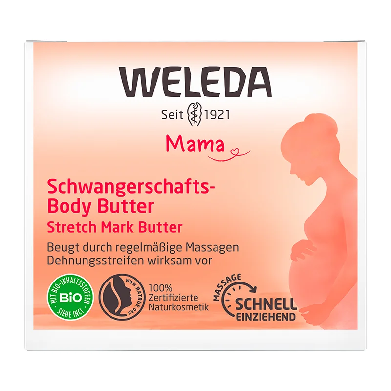Bieten Sie den Dehnungsstreifen mit der Schwangerschafts-Body Butter von Weleda die Stirn. Es pflegt und verbessert die Elastizität Ihrer Haut.Eine Schwangerschaft ist ein schönes Erlebnis, die nicht durch Dehnungsstreifen getrübt werden sollte. Mit fortschreitender Schwangerschaft wächst und wächst der Bauch. Damit die Haut elastisch bleibt, ist diese Pflege perfekt geeignet, um sie zu unterstützen. Diese reichhaltige und nährende Body Butter ist die ideale Wahl zur Vorbeugung von unerwünschten Dehnungsstreifen. Darüber hinaus kann die Sichtbarkeit bereits bestehender Dehnungsstreifen reduziert werden. Sie wurde in Zusammenarbeit mit Apotheken und Hebammen entwickelt. Wirkstoffe wie Tigergrasextrakt und Bio-Sheabutter regen die Kollagenbildung an, mindern Narbenbildung und pflegen Ihre Haut samtig-weich. Die Pflege enthält Inhaltsstoffe, die aus 100% natürlichen Ursprungs sind. Sie lässt sich leicht auftragen und zieht umgehend ein, ohne ein klebriges Gefühl zu hinterlassen. Mit dieser Körperbutter ist eine Massage einfach und unkompliziert. Ihrer Haut wird ausreichend Feuchtigkeit zugeführt und so vor dem Austrocknen geschützt. Auch wenn Sie mal nicht so viel Zeit für eine ausgiebige Massage haben, erhält Ihr Babybauch die nötige Pflege und Sie können bereits während der Schwangerschaft eine Bindung zu Ihrem Baby aufbauen. Mit dem dezenten Duft nach Rose, Neroli und Myrrhe können auch Ihre Sinne die Massage genießen. Sie werden sich wundern, wie entspannend eine Massage sein kann.