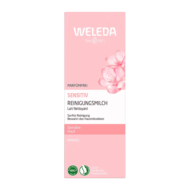 Entfernen Sie auf sanfte Weise Unreinheiten und Make-up Rückstände mit der Sensitiv Reinigungsmilch Mandel von Weleda.Bei einer empfindlichen Gesichtshaut sollte man nicht jedes Reinigungsprodukt verwenden. Weleda hat für die empfindliche Haut die sanfte Reinigungsmilch entwickelt. Mit der unparfümierten und sahnigen Textur reinigt es auf sanfte Weise. Sie wirkt rückfettend und hält Ihre empfindliche Haut im gesunden Gleichgewicht. Durch das Mandelöl ist diese Pflege besonders gut bei trockner und empfindlicher Haut geeignet, da sie sie nicht austrocknet oder reizt. Durch das Pflaumenkernöl enthält die Milch die Fähigkeit, die Epidermis vor freien Radikalen zu schützen. Ihr Haut wird für die nachfolgende Pflege bestens vorbereitet.
