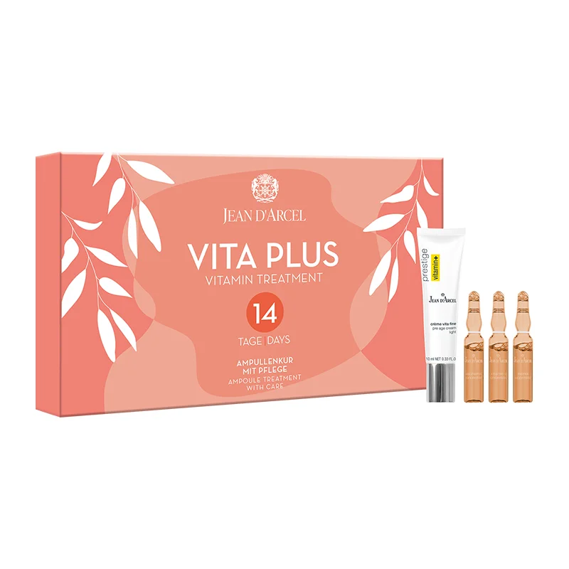 Mit diesem 14-Tage Kur Vita Plus Vitamin Treatment von Jean DArcel erhält Ihre Haut wieder mehr Vitalität und Strahlkraft. Die Ampullenkur enthält Multi-Vitamin Wirkstoffe, die wir ein Vitamin Booster wirken. Die Concentre Moisture Ampulle enthält konzentrierte Hyaluronsäure, die für eine intensive Feuchtigkeitsversorgung sorgt. Diese hilft Ihrer Haut, die Elastizität nachhaltig zu verbessern. Wie der Name der Concentre Vitamin C Ampulle schon erahnen lässt, versorgt diese Ihre Haut mit Vitamin C. Somit erhält Ihre müde und fahle Haut wieder mehr Strahlkraft. Eine porenverfeinernde, pigmentregulierende und feuchtigkeitsspendende Wirkung besitzt die Concentre Niacinamide Ampulle. Zeichen der Hautalterung werden dadurch gemindert. Der Hauterneuerungsprozess wird durch die Concentre Retinol Ampulle angeregt. Denn Retinol ist ein Bestandteil von Vitamin A, der die Hautstruktur verbessert. Als Unterstützung verwenden Sie die Creme Vita Fine täglich während der 14-Tage Kur. Sie ist eine 24h Pflege mit einem hocheffizienten Cocktail an Vitamin C, A und E und Pre-Aging Wirkstoffen. Dadurch werden feine Linien und Fältchen nachweislich gemildert und Ihre Haut geglättet.