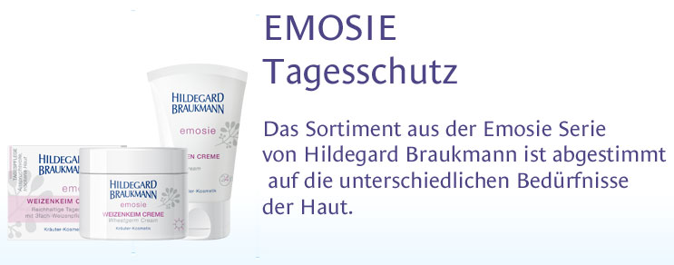 Das Sortiment aus der Emosie Serie von Hildegard Braukmann ist abgestimmt auf die unterschiedlichen Bedürfnisse der Haut.Ob ölige oder trockene und empfindliche Haut, in der Emosie Face Serie finden Sie für fast jeden Hauttyp die entsprechenden Pflegeprodukte - zum kleinen Preis.