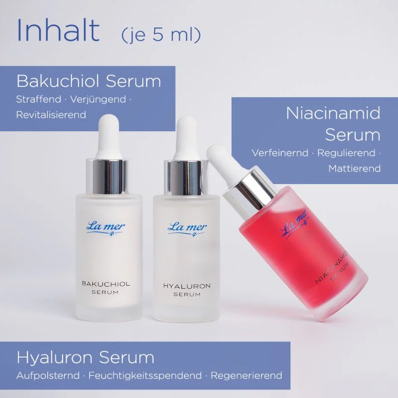 Erleben Sie die geballte Pflegekompetenz von La mer mit dem Wirkstoff-Seren Set, das drei hochwirksame Seren für die tägliche Beauty-Routine enthält. Das Hyaluron Serum versorgt Ihre Haut mit intensiver Feuchtigkeit, polstert sie sichtbar auf und unterstützt die Regeneration. Dank Hyaluronsäure in verschiedenen Molekülgrößen (Hymagic 4D) wirkt es in unterschiedlichen Hautschichten. Grünalgen-Extrakt sorgt für einen sofortigen Feuchtigkeits-Boost. Das Niacinamid Serum sorgt für einen gleichmäßigen, klaren Teint. Niacinamid (Vitamin B3) mindert Pigmentflecken und verfeinert Poren, während Panthenol beruhigend wirkt. Biotin und Vitamin B12 pflegen und stärken die Haut, ein Regenbogenalgen-Extrakt reduziert Pigmentunregelmäßigkeiten. Das Bakuchiol Serum, die pflanzliche Alternative zu Retinol, strafft, regeneriert und revitalisiert die Haut. Bakuchiol wirkt faltenreduzierend und ebenmäßigkeitsfördernd. Meeresschlick-Extrakt und wertvolle Braunalgen spenden nachhaltig Feuchtigkeit, verbessern die Elastizität und stärken die Hautschutzbarriere. Das Zusammenspiel dieser drei Seren macht Ihre Haut sichtbar glatter, strahlender und jugendlicher. Ob einzeln oder in Kombination angewendet - das Set bietet maximale Flexibilität für Ihre individuelle Pflegeroutine.